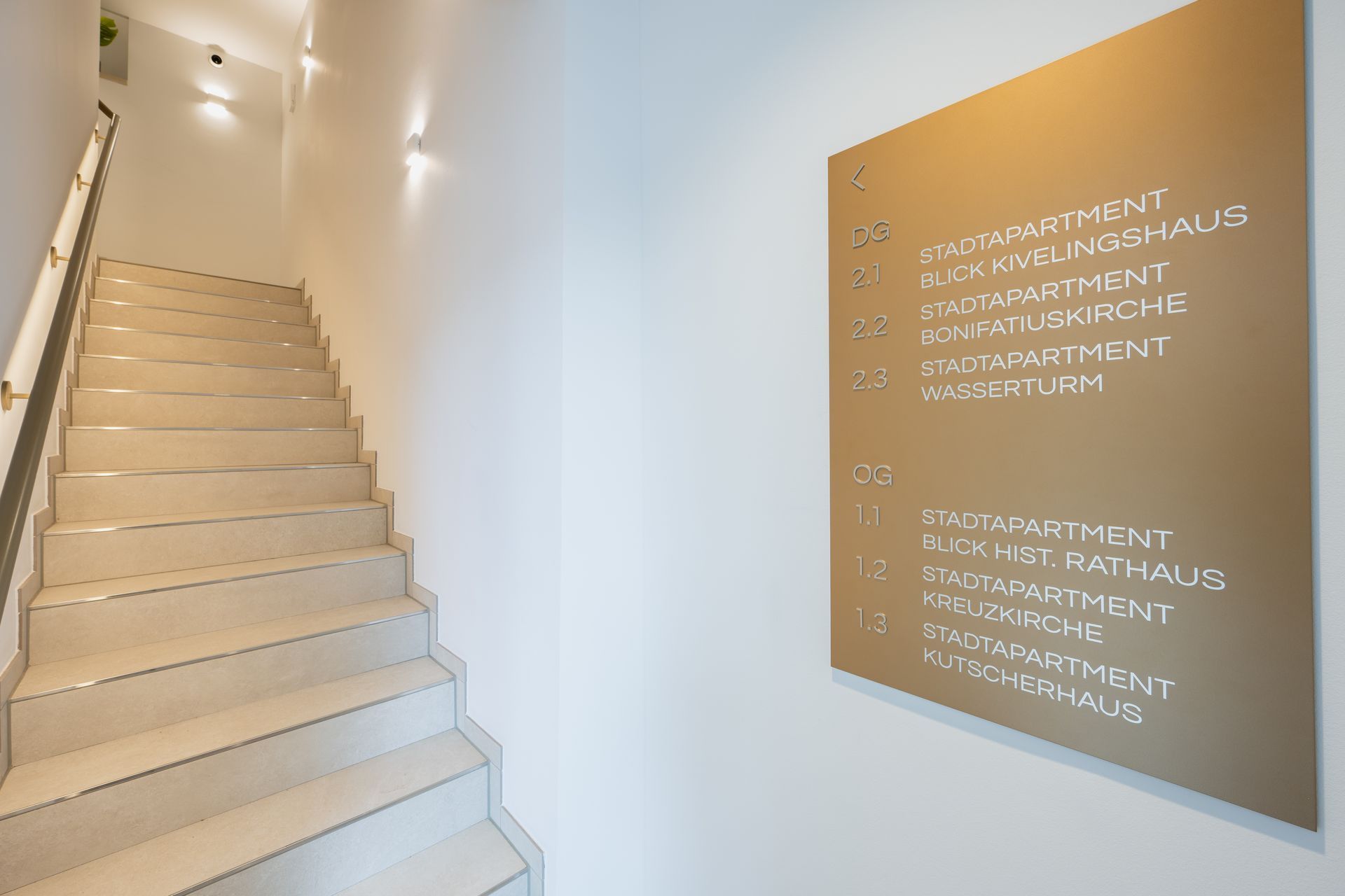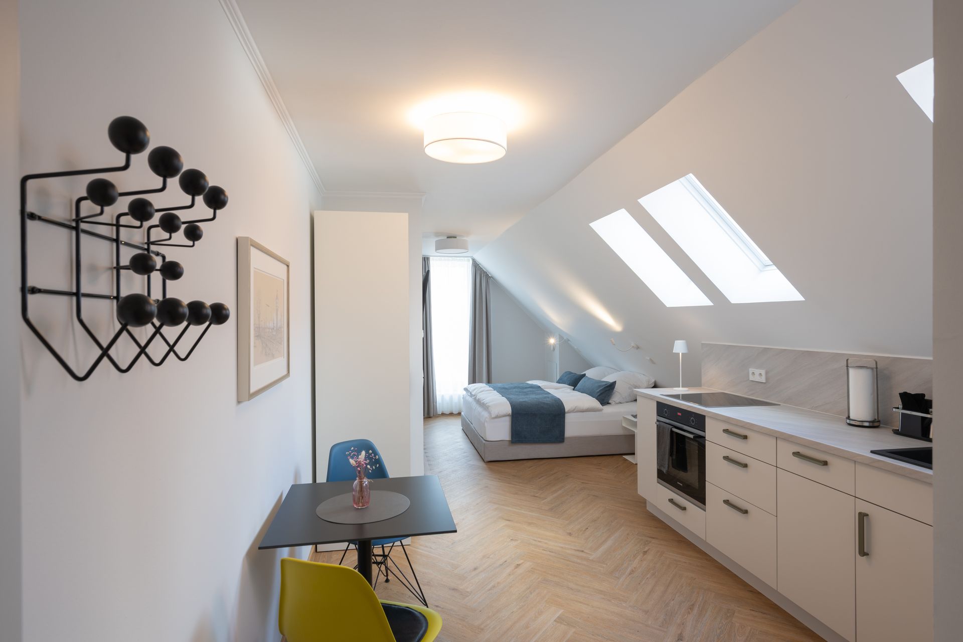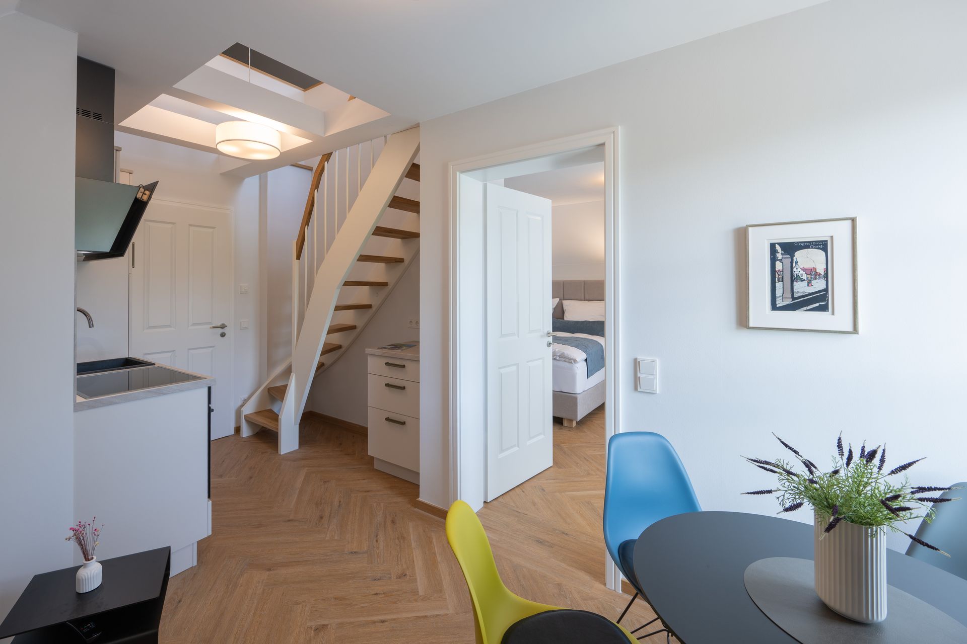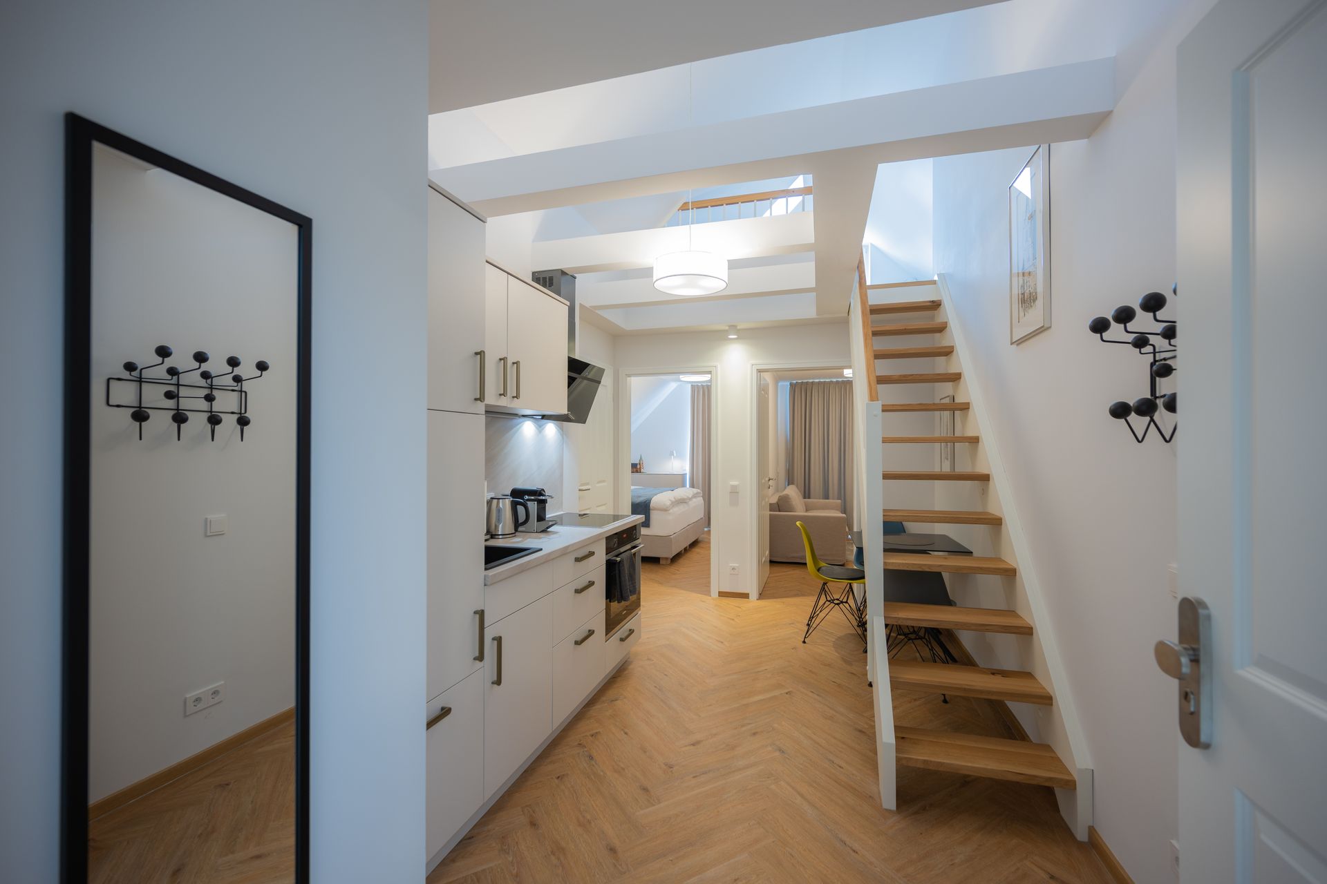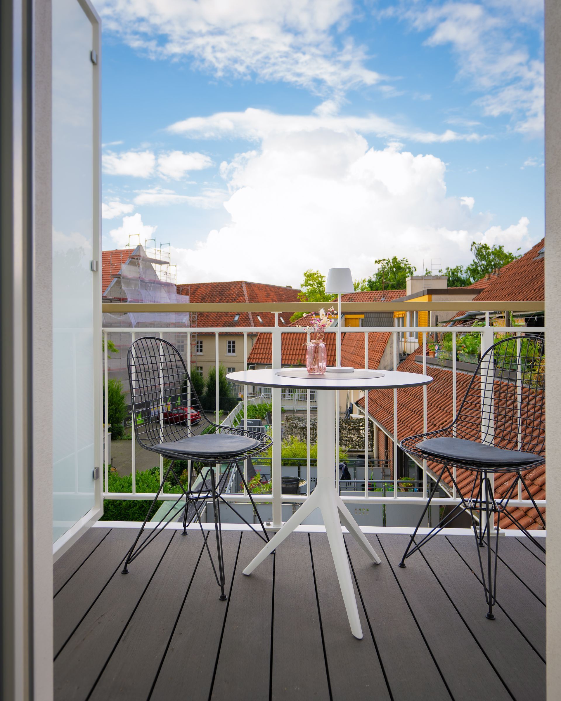 Die Wohnungen sind zwischen 26 und 58 Quadratmeter groß und bieten jeweils eine großzügige und umfassende Ausstattung für bis zu vier Personen – mit durchdachten Küchen, hochwertigen Bädern mit ebenerdigen Duschen, stilvollem Interieur und einem individuellen Grundriss, der sich stets leicht von den anderen unterscheidet. Einige Einheiten erstrecken sich über zwei Ebenen; eine bietet einen großzügigen Balkon direkt zum Marktplatz, vier weitere jeweils einen Balkon zum Universitätsplatz. Im Erdgeschoss befindet sich zudem eine barrierefreie Wohnung – ideal für Gäste mit eingeschränkter Mobilität. Auf einen Aufzug wurde in dem traditionsreichen Gebäude bewusst verzichtet, um die bestehende Bausubstanz zu erhalten.